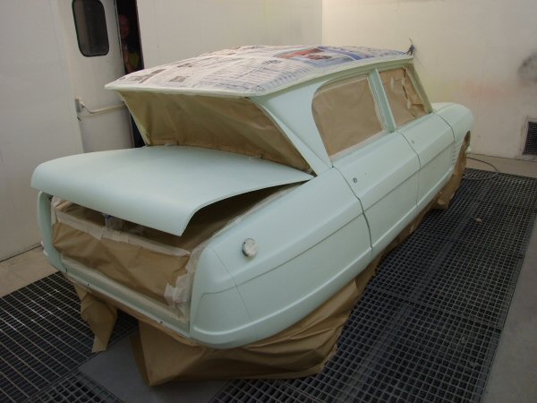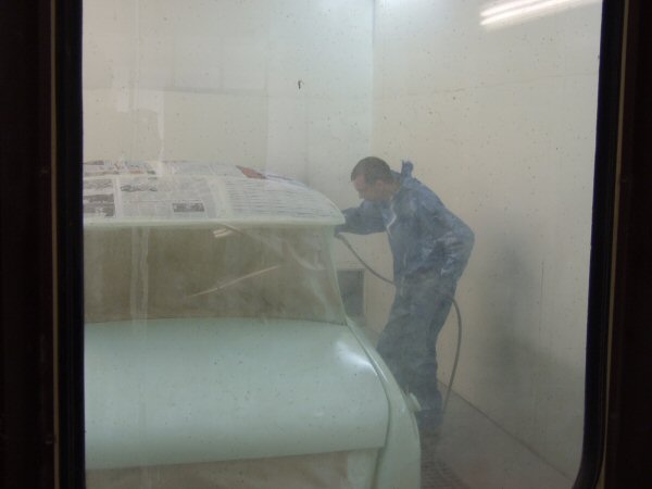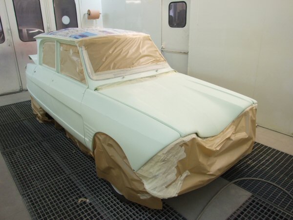 La voiture poncée arrive en cabine de peinture. Elle sera préparée la veille et peinte un samedi matin à 8h par mon ami Cyril. Après avoir séchée quelques heures en cabine à haute température, je pourrais récupérer la voiture vers 15h.